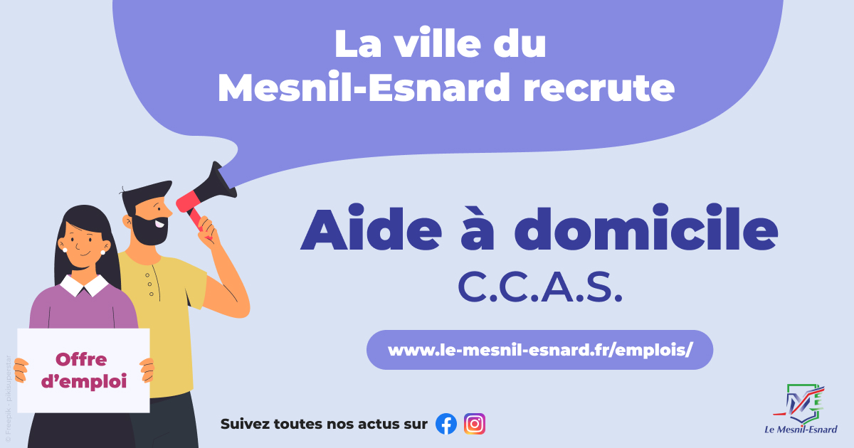 URGENT – RECRUTEMENT UN(E) AIDE À DOMICILE CDD 6 mois renouvelable – Temps complet (35 h) Placé(e) sous l’autorité de la Directrice du C.C.A.S. du Mesnil-Esnard, vous interviendrez auprès des personnes âgées afin de les accompagner dans les actes de la vie quotidienne et de favoriser leur maintien à domicile dans les meilleures conditions. Missions […]