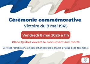 🇫🇷 Le Maire, Jean-Marc VENNIN, et l’ensemble du Conseil Municipal ont l’honneur de vous convier à la Cérémonie commémorative de la Victoire du 8 mai 1945.