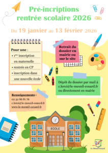 - 1ère inscription pour les élèves Mesnillais (nés en 2023, 2022, 2021) entrant en maternelle :