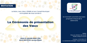 Rendez-vous le jeudi 15 janvier à 20h à la salle des fêtes pour la cérémonie de présentation des vœux 2026.